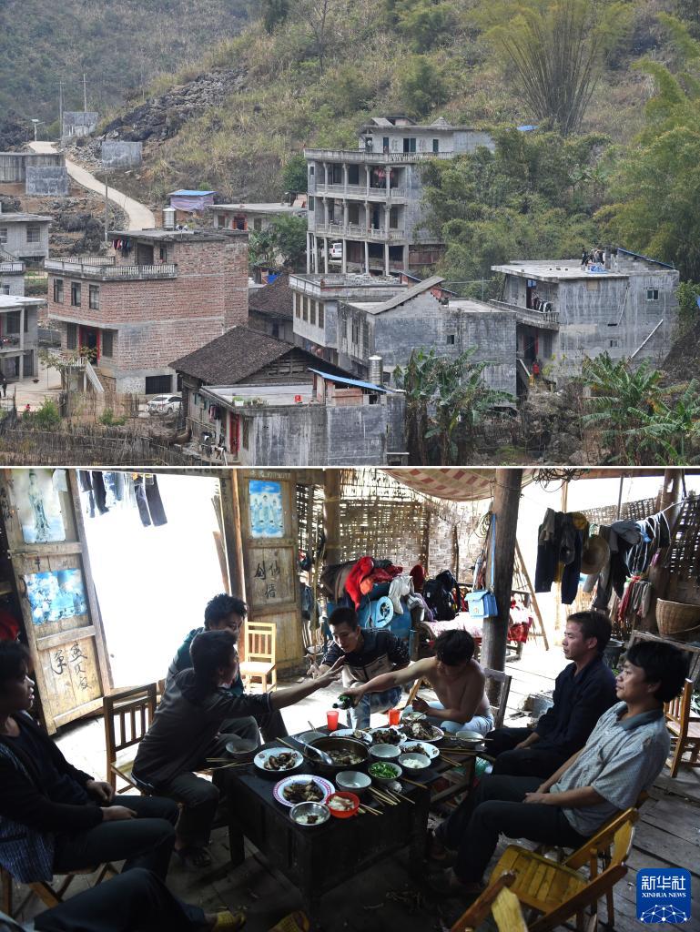 拼版照片:上圖為2023年1月21日拍攝的弄勇村弄朝屯村民藍有平的樓房(最高處);下圖為2015年2月26日,在弄勇村弄朝屯,藍有平(左三)在簡陋的木瓦房里吃飯。