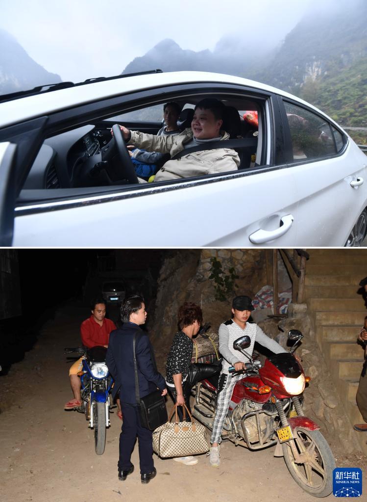 拼版照片:上圖為2023年1月28日,在弄勇村弄朝屯,村民藍有平駕車去廣州務工;下圖為2015年2月28日凌晨,藍有平(左二)準備搭摩托車到鄉里換乘班車,前往廣州務工。