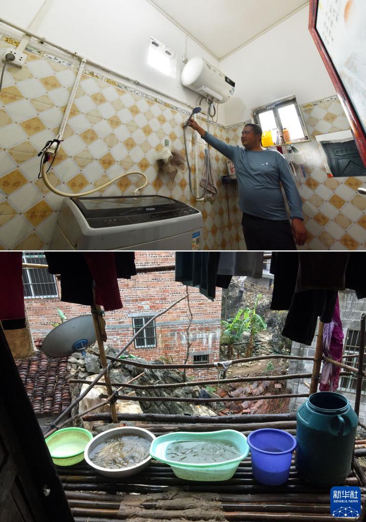 拼版照片:上圖為2023年1月21日,在弄勇村弄朝屯,村民藍財宏家里安裝的熱水器和洗衣機;下圖為2015年2月14日,藍財宏用桶和盆收集屋檐雨水。