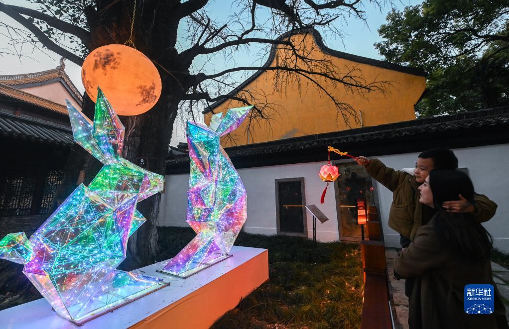 1月29日,在嘉興市秀洲區新塍古鎮小蓬萊公園內,游客在觀賞“鰲山燈會”的兔子彩燈。
