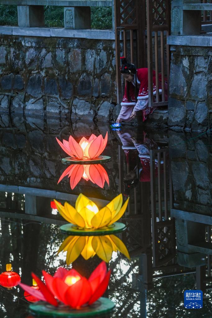1月29日,在嘉興市秀洲區新塍古鎮小蓬萊公園內,身著傳統服飾的游客在“鰲山燈會”現場放下“心愿燈”。