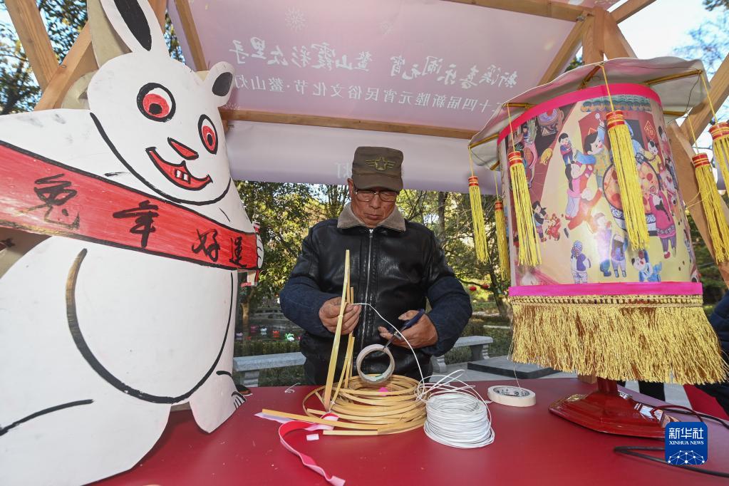 1月29日,在嘉興市秀洲區新塍古鎮小蓬萊公園內,傳統藝人在“鰲山燈會”現場展示紙扎燈技藝。