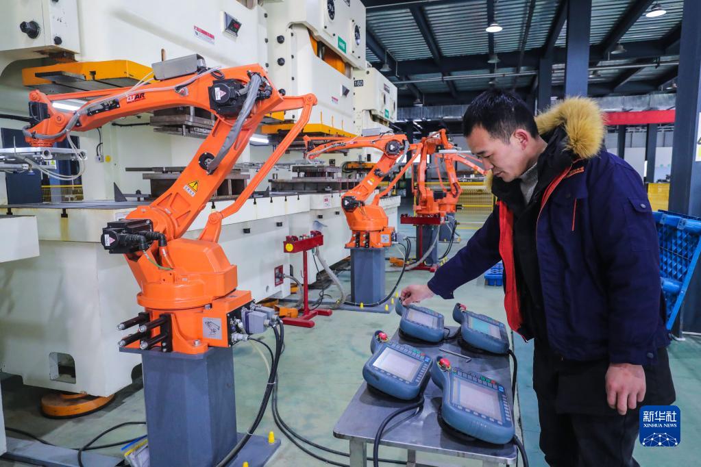 1月29日,在河南省信陽市光山縣三元光電科技扶貧車間內,工人操作機器人趕制新年訂單產品。
