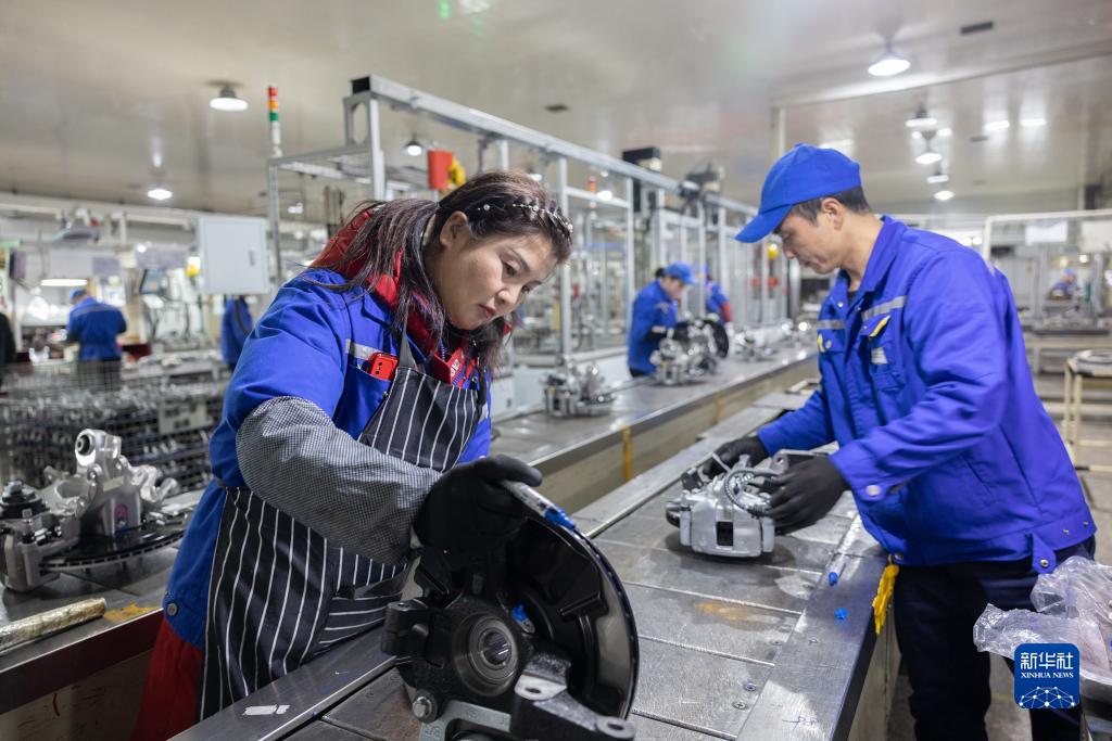 1月29日,浙江省諸暨市店口鎮浙江萬安智馭汽車控制系統有限公司的工人正在裝配盤式制動器。
