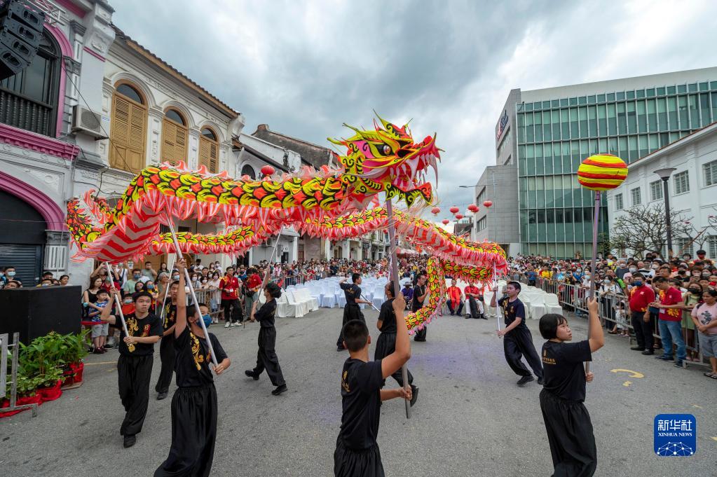這是1月28日在馬來西亞檳城州首府喬治市舉行的檳城廟會上拍攝的舞龍表演。