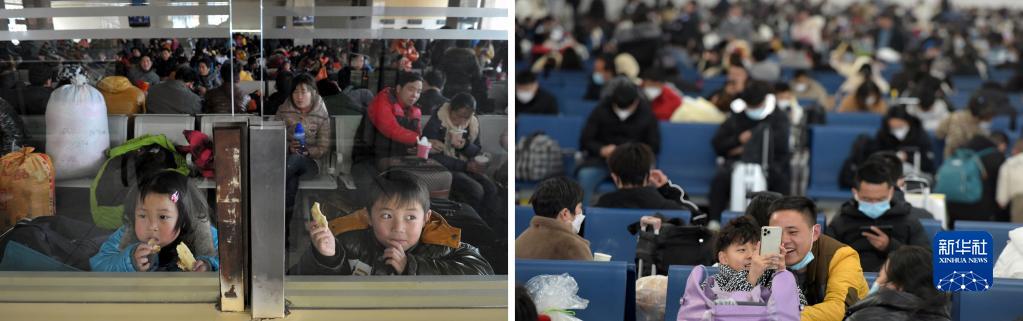 拼版照片:左圖為2012年2月3日,旅客在阜陽火車站候車室候車;右圖為2023年1月27日,旅客在阜陽西站候車室候車。