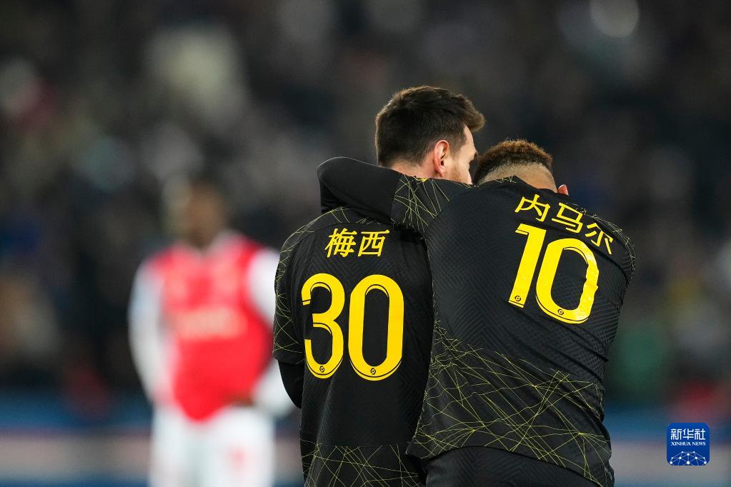 1月29日,在法國巴黎王子公園球場,巴黎圣日耳曼隊球員梅西(左)和隊友內馬爾身著印有中文名字的隊服。