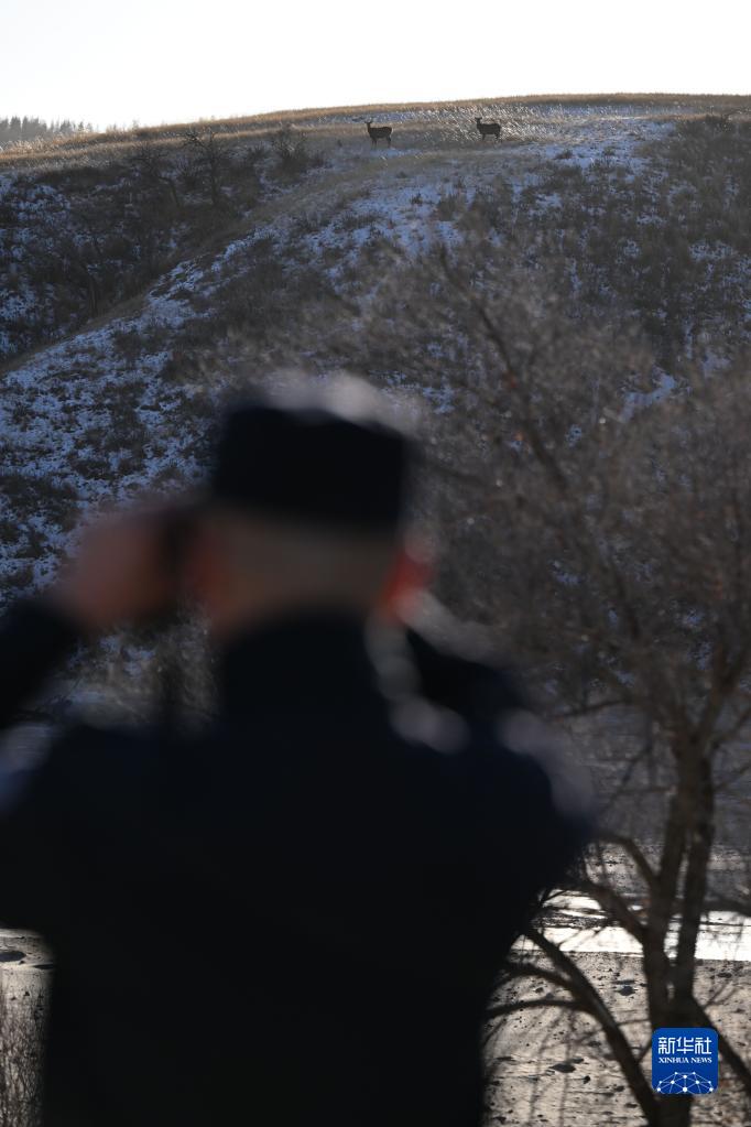 1月29日,多倫縣森林公安局灤河源國家森林公園森林公安派出所的民警在森林公園內察看遠處馬鹿。