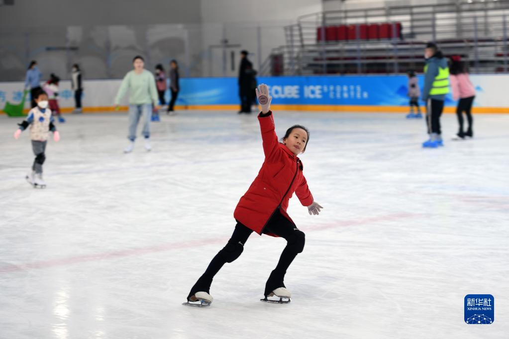 1月29日,一名小朋友在“冰立方”冰上運動中心滑冰。