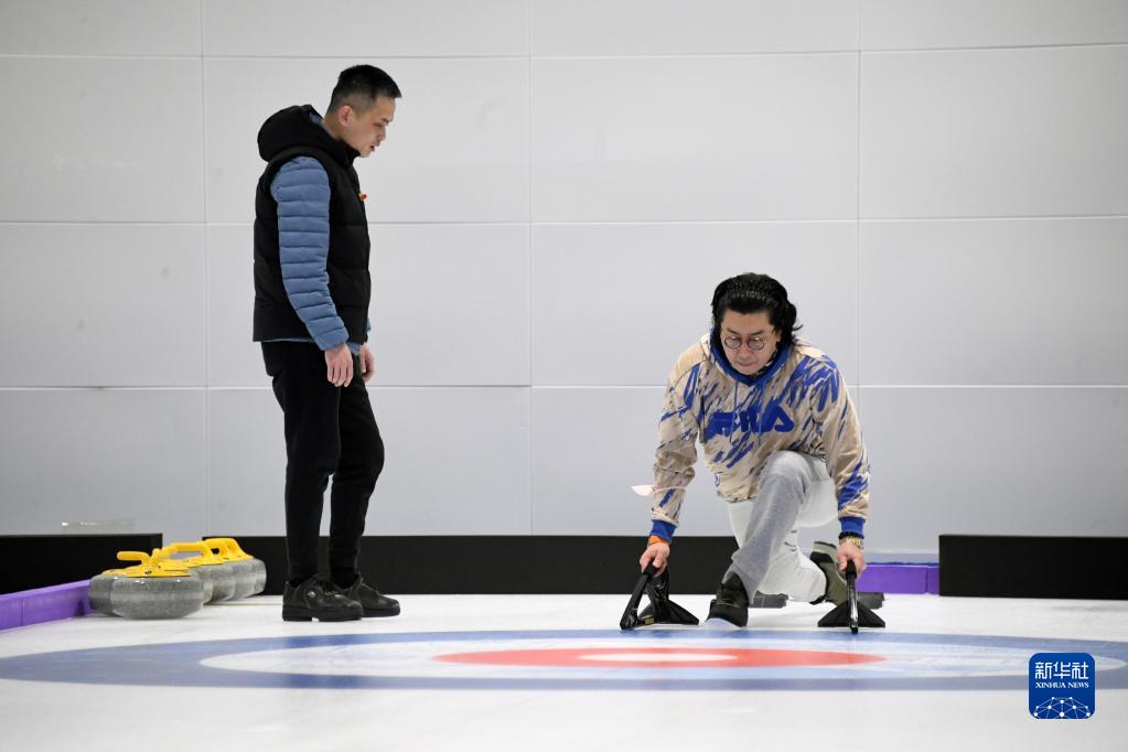 1月29日,游客(右)在“冰立方”冰上運動中心練習冰壺基礎動作。