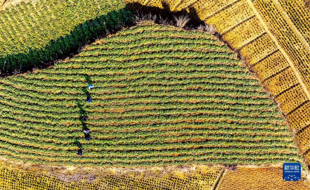 1月30日,村民在貴州省黔西市蓮城街道老鴰河社區地里勞作(無人機照片)。
