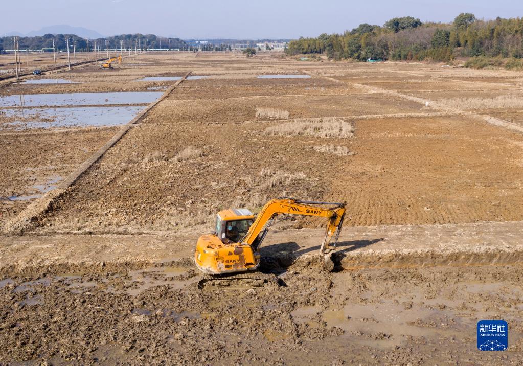 1月29日,在江西省撫州市金溪縣秀谷鎮五里村高標準農田建設現場,施工人員開動機械設備建設高標準農田。