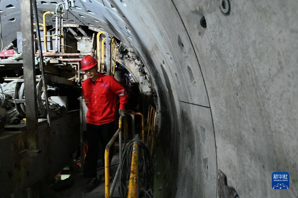 1月29日,施工人員在福州地鐵4號線金牛山站至洪塘站區間的下穿閩江底隧道內施工作業。