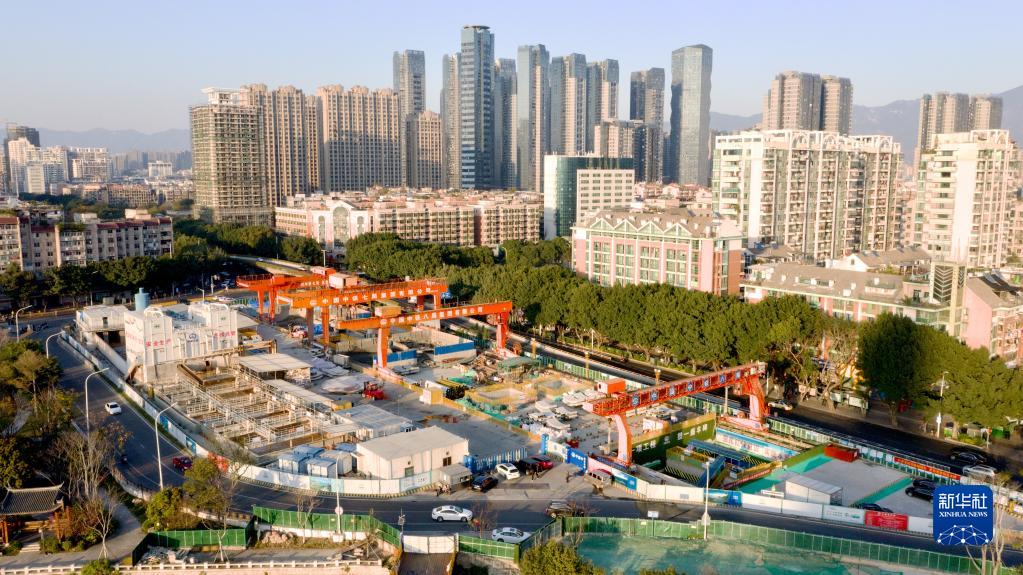 這是1月29日拍攝的福州地鐵濱??炀€南公園站地面施工區域(無人機照片)。
