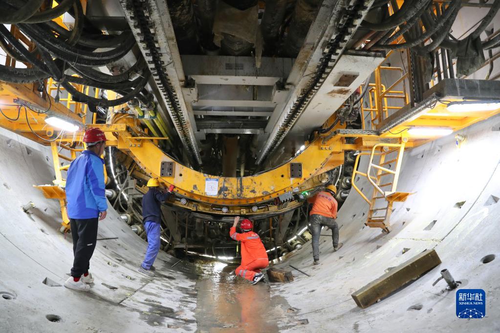 在福州地鐵濱??炀€南公園站至三叉街站掘進區間,中鐵八局建設者檢查盾構機(1月29日攝)。目前福州地鐵濱??炀€全線車站已動工,10個車站主體結構已封頂,19臺盾構機正在掘進。