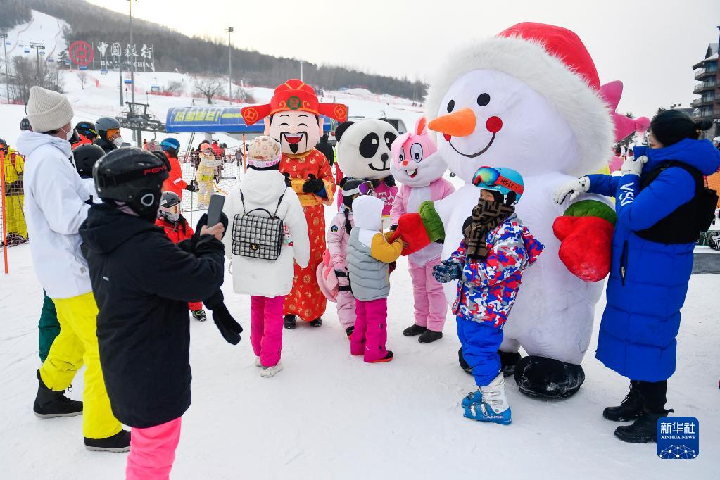 在吉林市萬科松花湖度假區,小朋友們與卡通人偶互動(1月23日攝)。