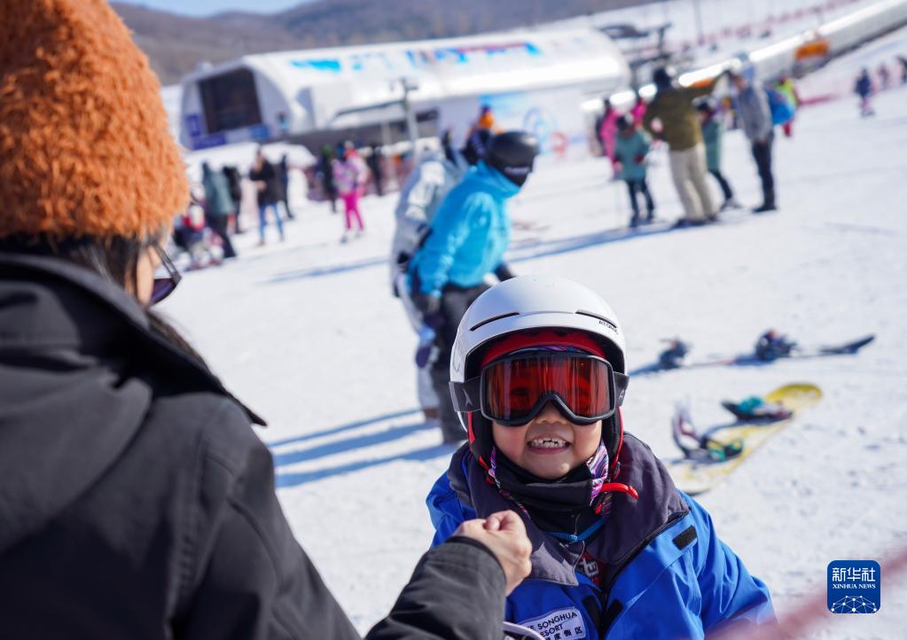 1月30日,小朋友在吉林市萬科松花湖度假區滑雪。