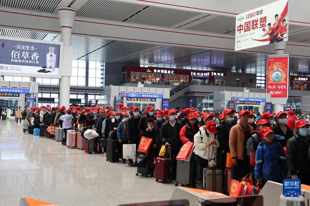 當日,D2879次務工專列從貴陽北站發車。這是2023年貴陽開出的首趟高鐵務工專列,搭載600余名外出務工人員南下就業。據了解,該趟務工專列由貴州省黔南州、廣東省廣州市的人社部門根據務工人員返崗需求定制加開。
