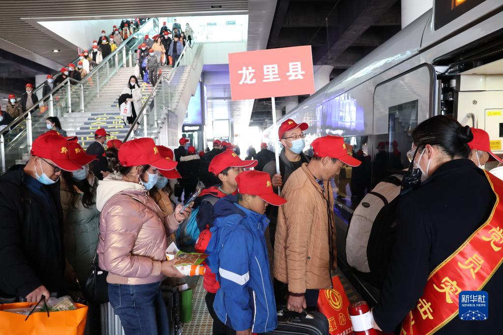 當日,D2879次務工專列從貴陽北站發車。這是2023年貴陽開出的首趟高鐵務工專列,搭載600余名外出務工人員南下就業。據了解,該趟務工專列由貴州省黔南州、廣東省廣州市的人社部門根據務工人員返崗需求定制加開。