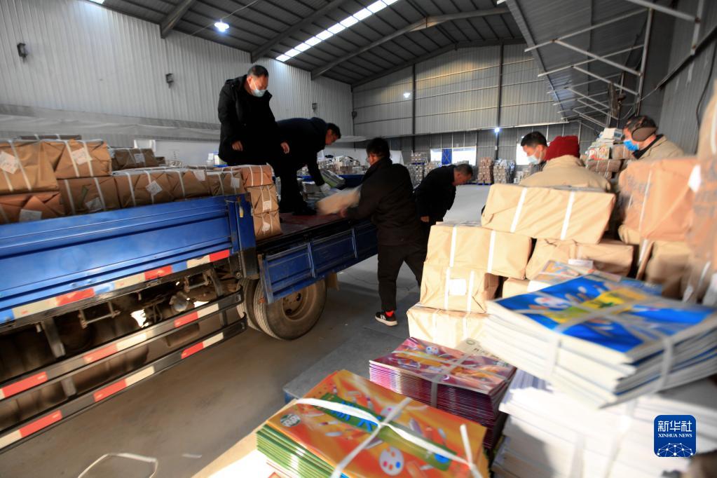 1月30日,在山東省臨沂市平邑縣新華書店倉庫,工作人員在搬運教材。