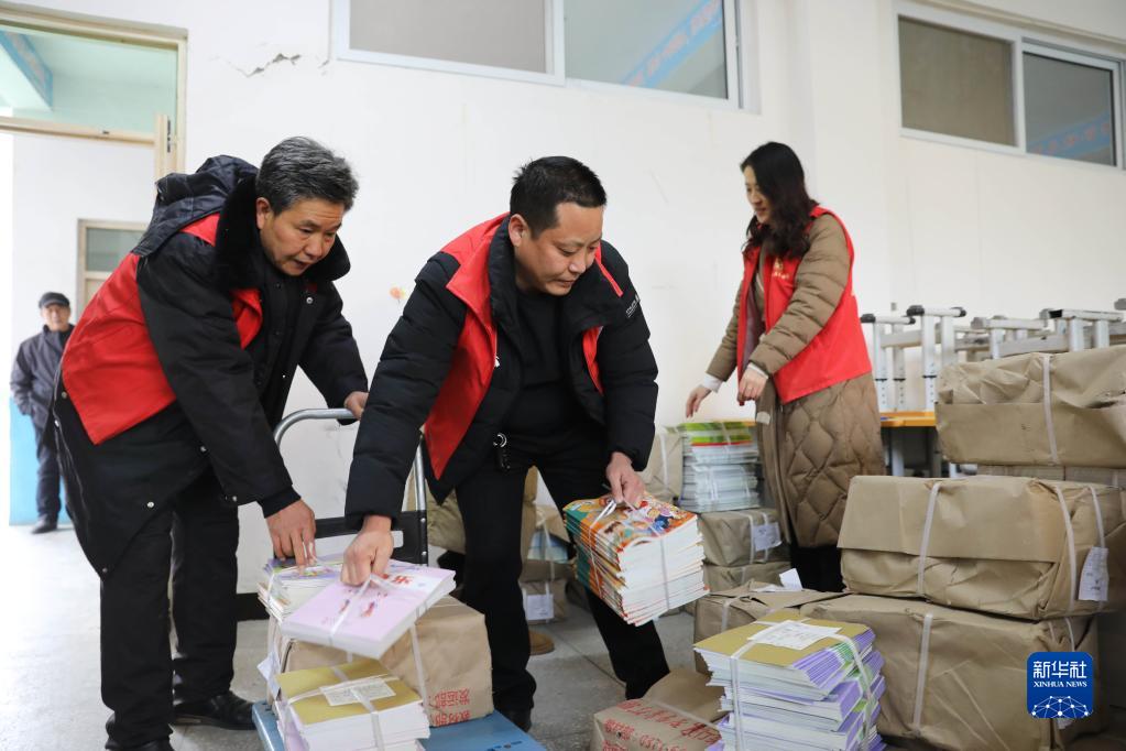1月30日,河南省寶豐縣香山路小學的教師在整理教材。