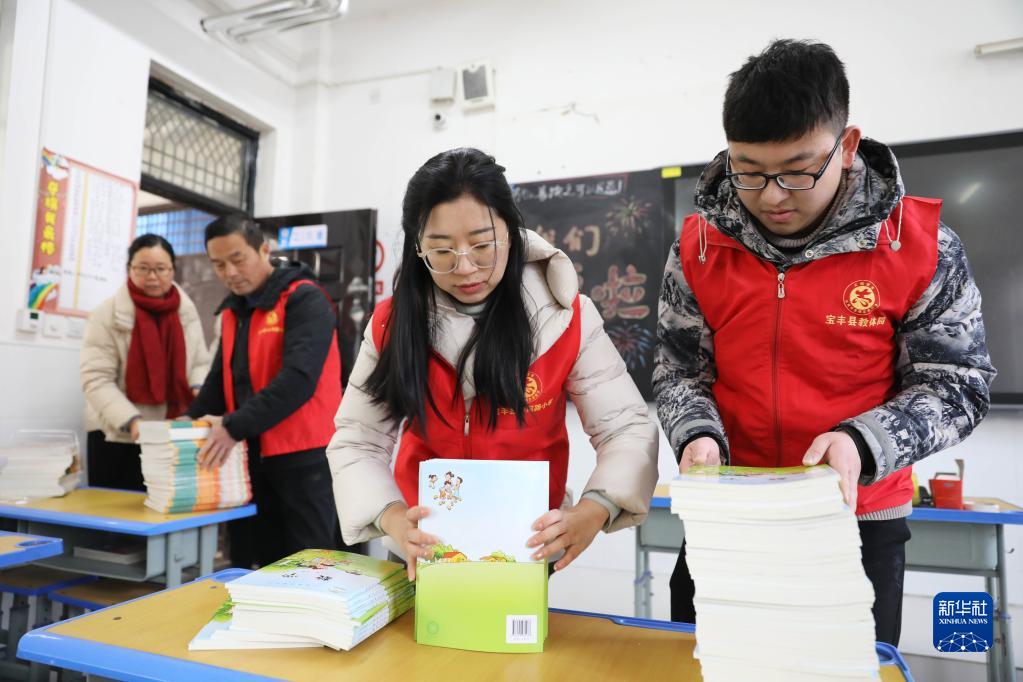 1月30日,在河南省寶豐縣山河路小學,教師在清點教材。