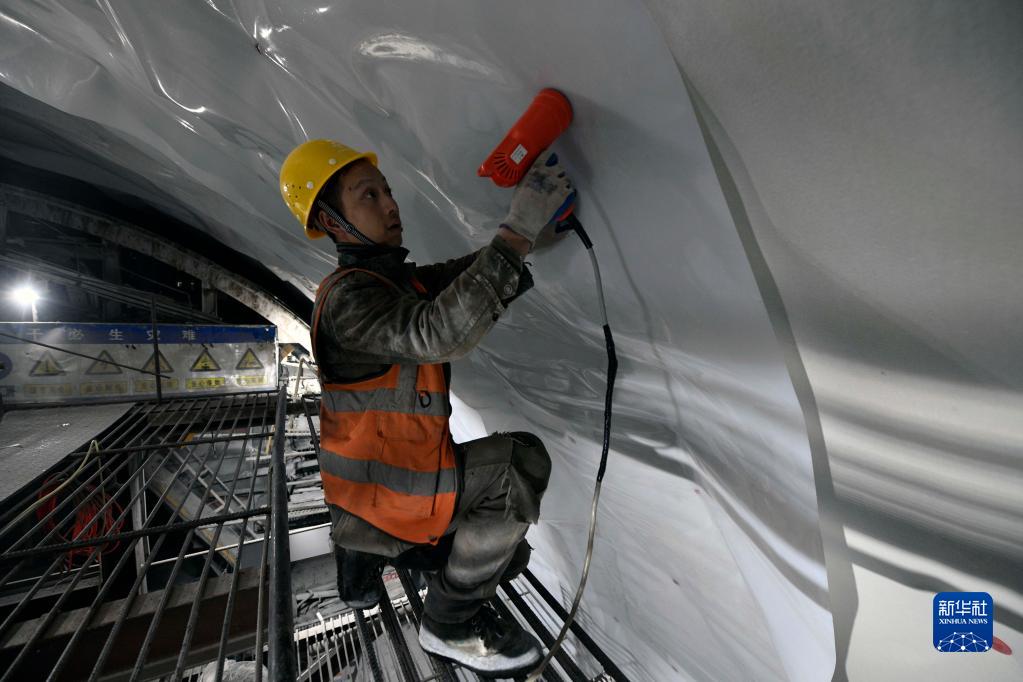 1月30日,在首都地區環線高速公路承德至平谷段楊家窩鋪特長隧道施工現場,工人在鋪設防水板。