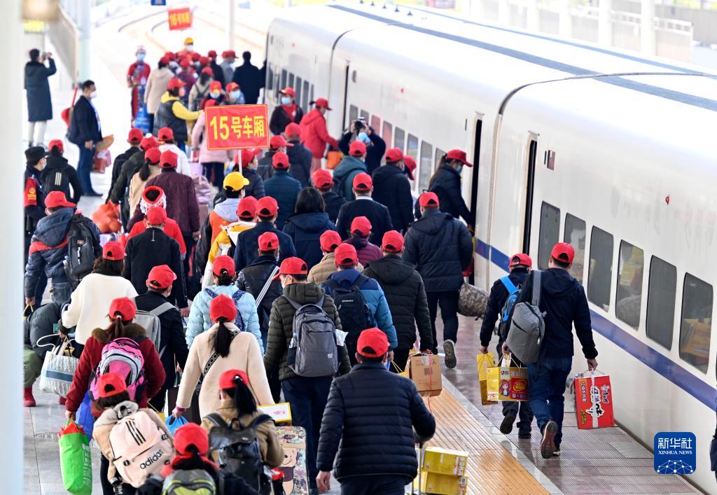 當日,2023年廣西柳州市首趟“點對點”送工服務專列D3755次列車從柳州火車站發車,500多名來自柳州市各縣區的務工人員乘坐動車前往廣東返崗復工。