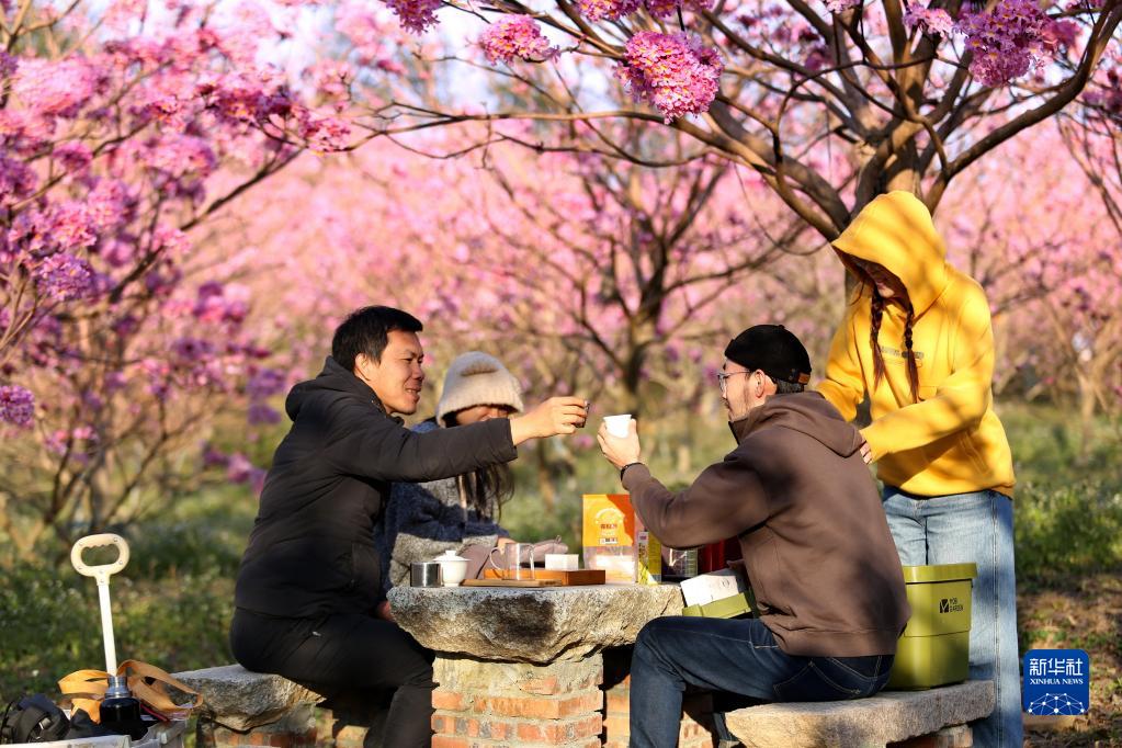 1月29日,在江門市新會區大澤鎮山頭坪,游客在花海中泡茶。