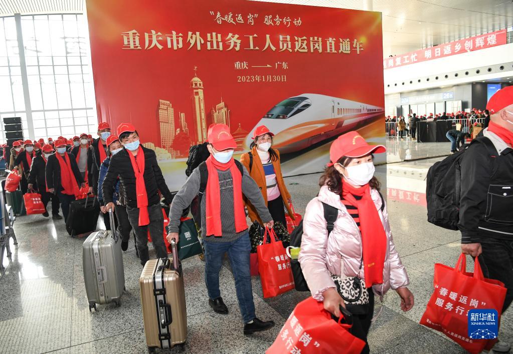 當日,由重慶西開往廣州南的D4881次務工專列順利開出,來自川渝兩地的約890名務工人員踏上返崗之路,這是2023年從重慶開行的首趟務工定制專列。