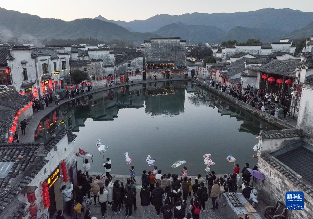 兔年新春,在安徽省黃山市黟縣宏村,當地舉行的花燈研習班邀請游客共同制作兔子形狀花燈。傍晚時分,五顏六色的“兔燈”在古村中點亮,游客在“鬧花燈”中體驗徽州年俗。
