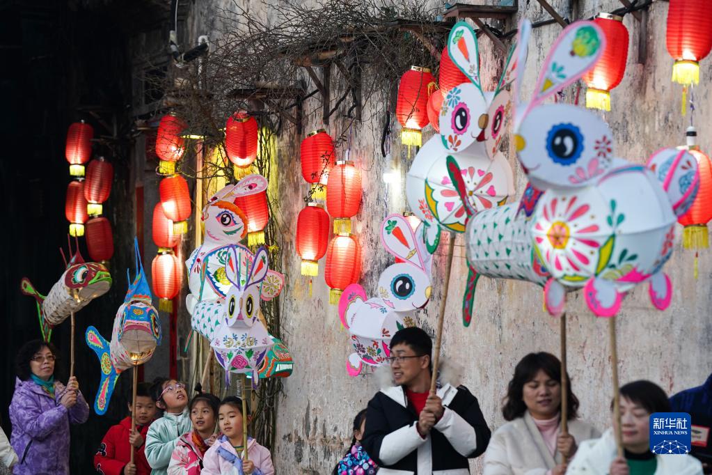 兔年新春,在安徽省黃山市黟縣宏村,當地舉行的花燈研習班邀請游客共同制作兔子形狀花燈。傍晚時分,五顏六色的“兔燈”在古村中點亮,游客在“鬧花燈”中體驗徽州年俗。