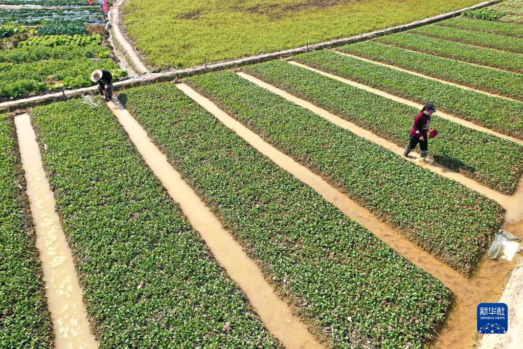 1月30日,村民在廣西南寧市青秀區仙葫經濟開發區那舅社區那平村給菜苗澆水(無人機照片)。