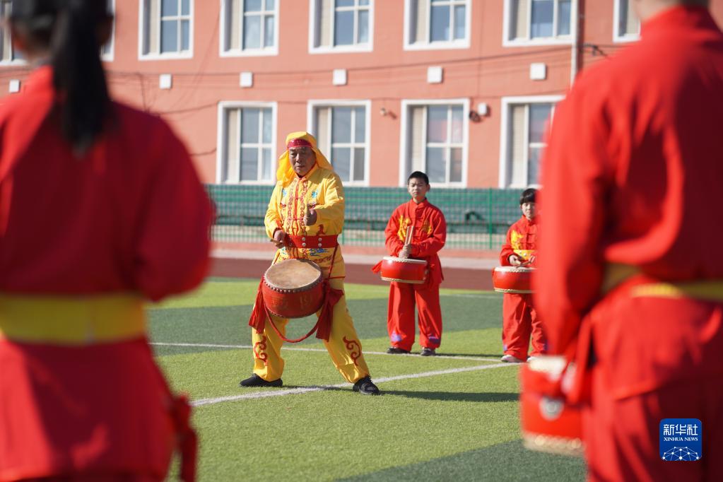 寒假期間,河北省邢臺市內丘縣官莊中心小學開設文化課堂,邀請當地排鼓藝人向學生教授排鼓知識,讓學生感受家鄉文化的魅力,豐富假期生活。