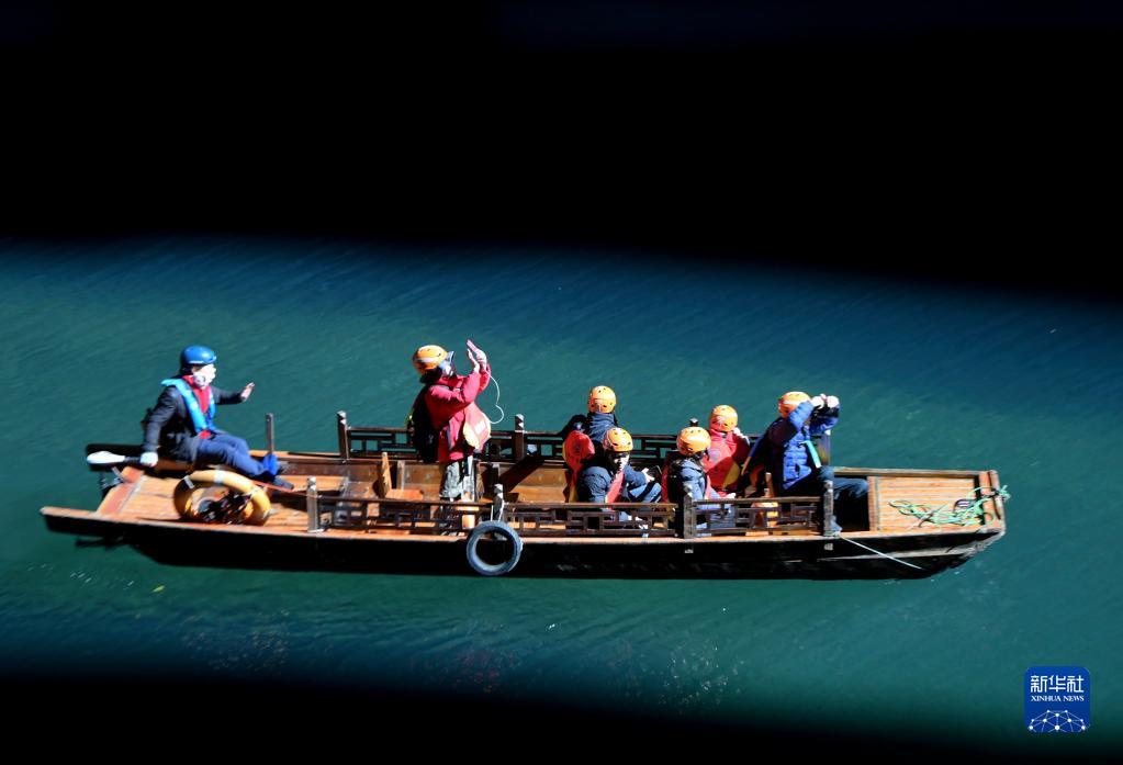 1月28日,游人在鶴峰縣屏山旅游景區乘船游玩。