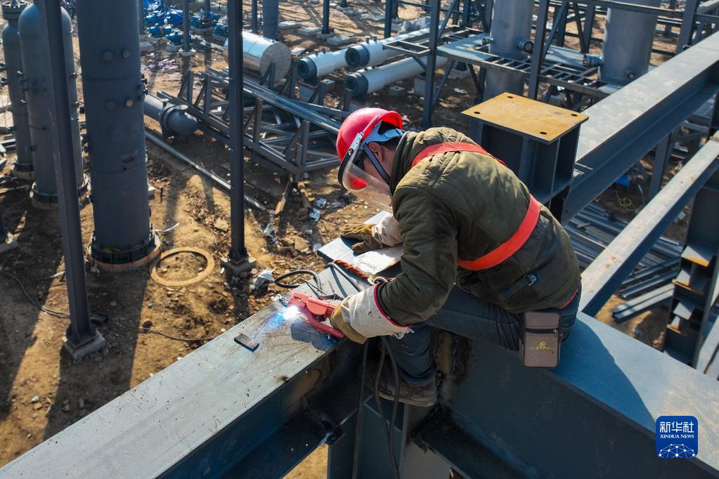 1月30日,工人在湖北省孝感市云夢縣鹽化工循環利用產業園區進行電焊作業(無人機照片)。