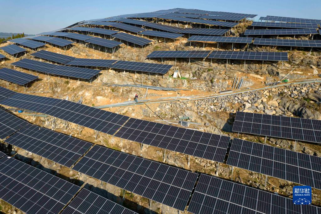 1月30日,工人在貴州省黔西市一光伏電站項目施工現場忙碌(無人機照片)。