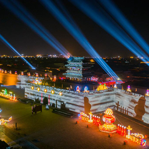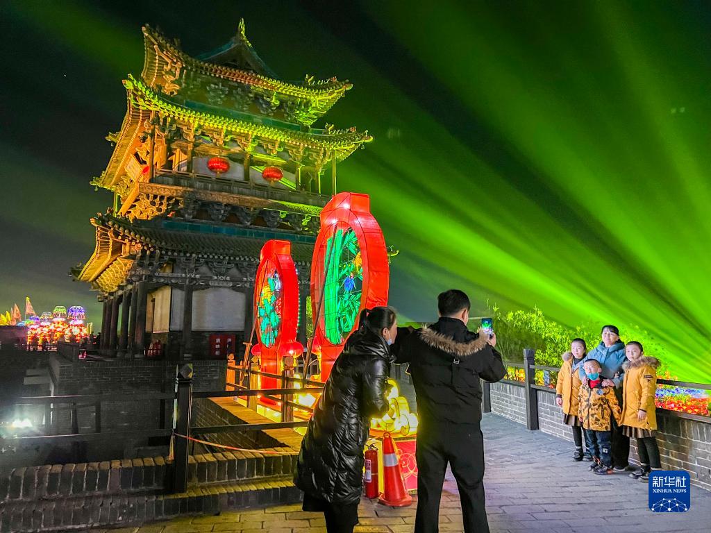 1月29日,游客在山西省晉中市平遙古城的燈光秀前拍照留念。