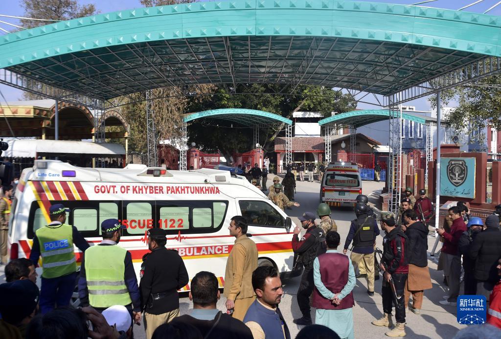 1月30日,在巴基斯坦西北部開伯爾-普什圖省首府白沙瓦市,救護車抵達爆炸襲擊事件現場。