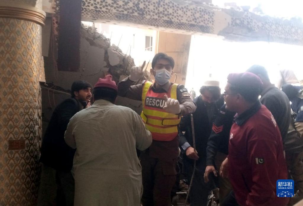 1月30日,在巴基斯坦西北部開伯爾-普什圖省首府白沙瓦市,人們在爆炸襲擊事件現場搜救(手機拍攝)。