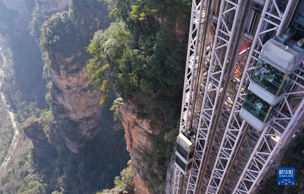 1月30日,游人乘坐張家界百龍天梯游覽(無人機照片)。