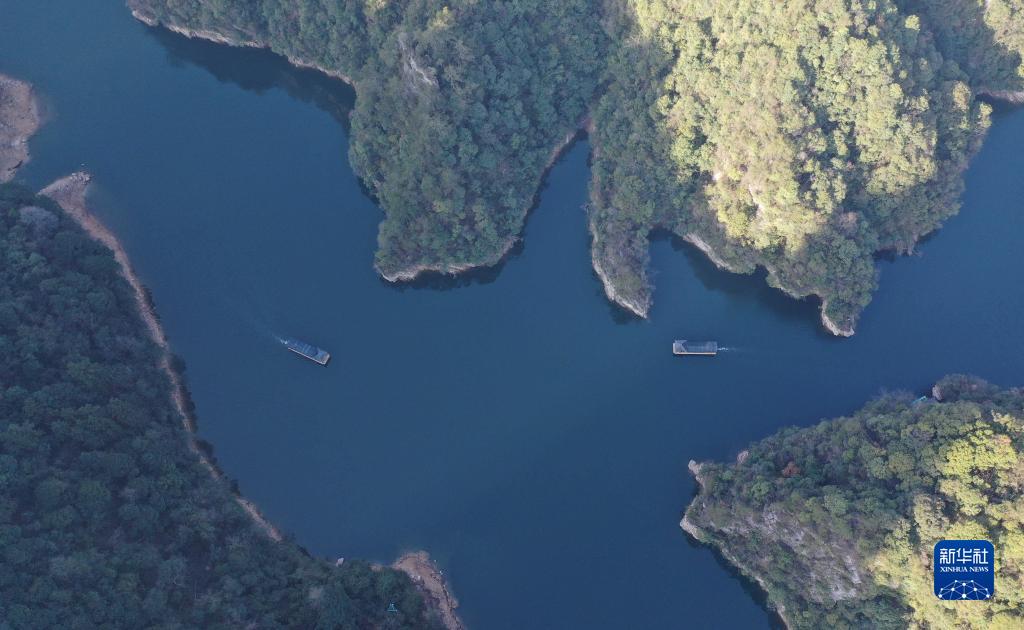 1月30日,游人乘船在湖南張家界寶峰湖景區游玩(無人機照片)。