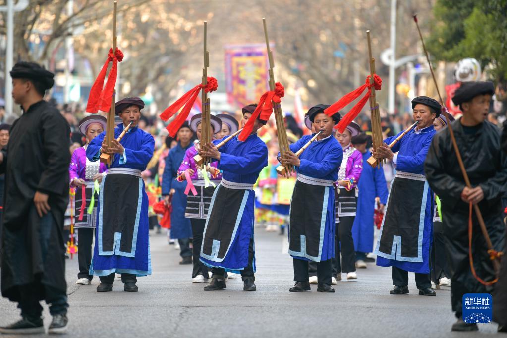 當日是正月初九,貴州省黔南布依族苗族自治州龍里縣舉辦傳統民俗“踩街”活動,通過花燈巡演、花棍舞、蘆笙舞、舞龍舞獅等民俗活動,歡度新春。