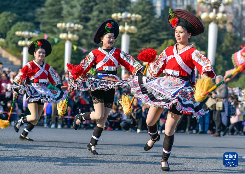 當日是正月初九,貴州省黔南布依族苗族自治州龍里縣舉辦傳統民俗“踩街”活動,通過花燈巡演、花棍舞、蘆笙舞、舞龍舞獅等民俗活動,歡度新春。