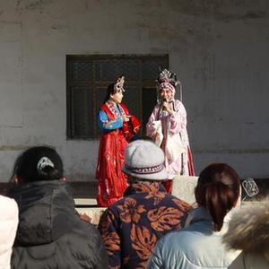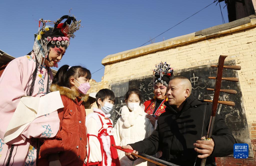 1月30日,在邢臺市襄都區北大街街道辦事處新興東社區,演員給孩子們講解非物質文化遺產四股弦知識。