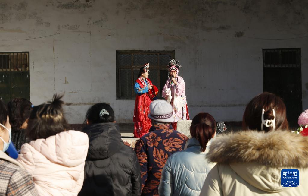 1月30日,在邢臺市襄都區北大街街道辦事處新興東社區,演員在表演四股弦傳統劇目。