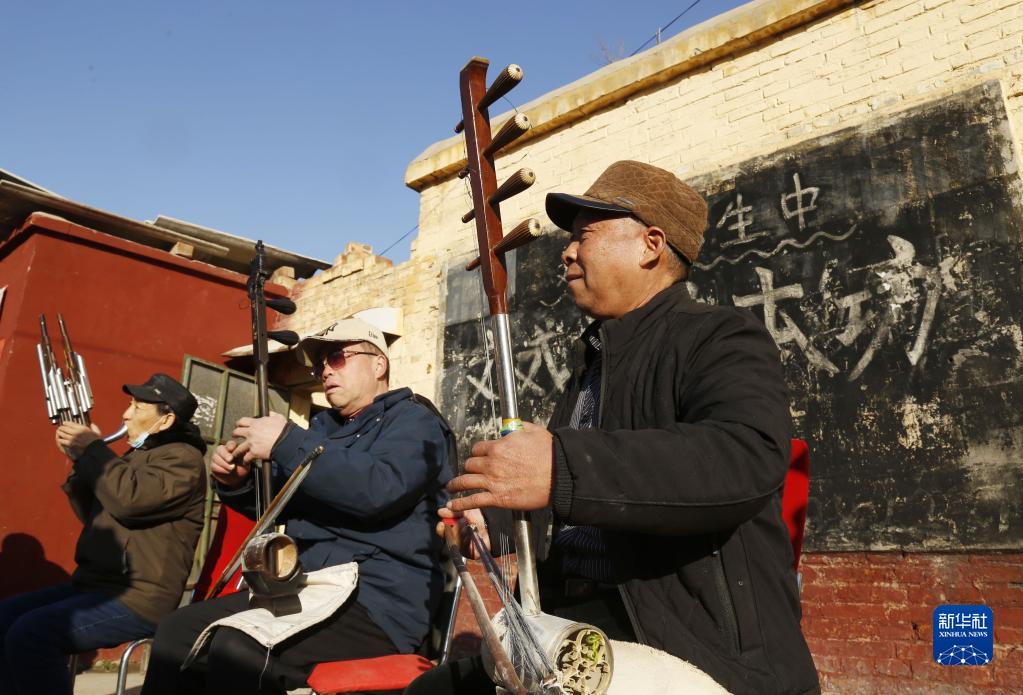 1月30日,在邢臺市襄都區北大街街道辦事處新興東社區,樂師在演奏四股弦。