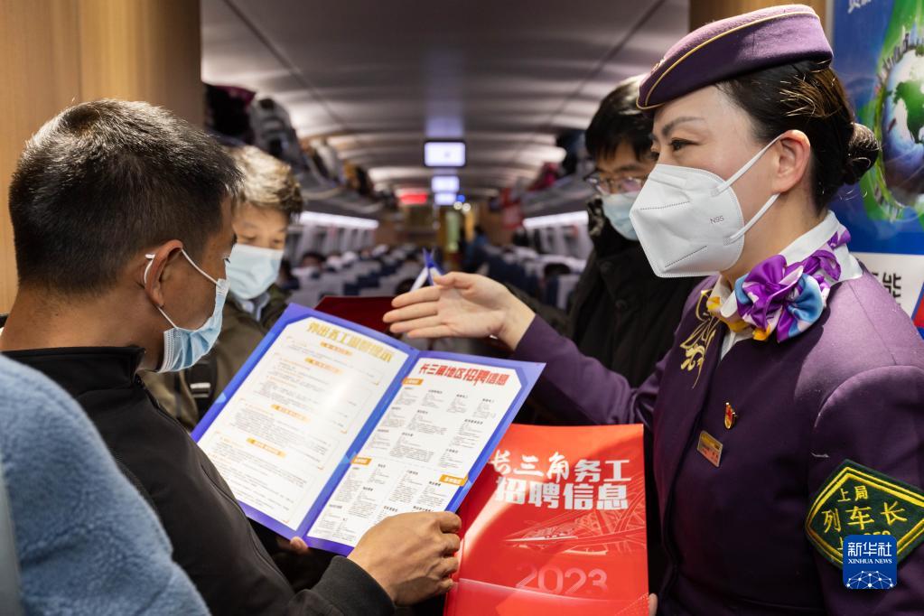 1月30日,在阜陽開往上海的G7445次列車上,鐵路上??瓦\段乘務人員向旅客介紹長三角務工招聘信息。