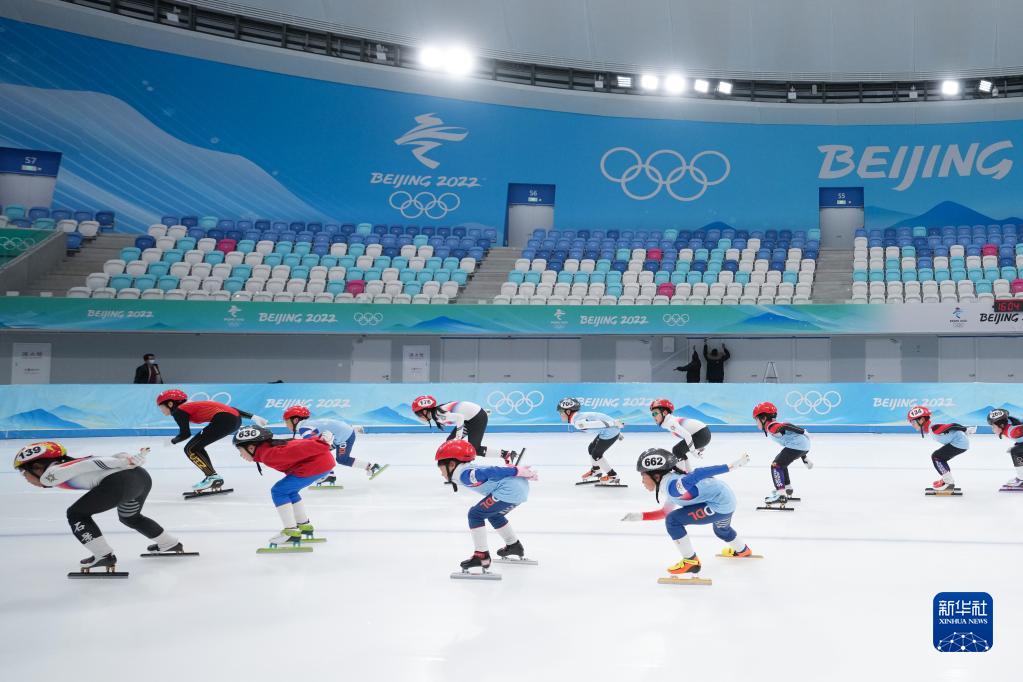2023年1月6日,小朋友們在國家速滑館進行短道速滑訓練展示。