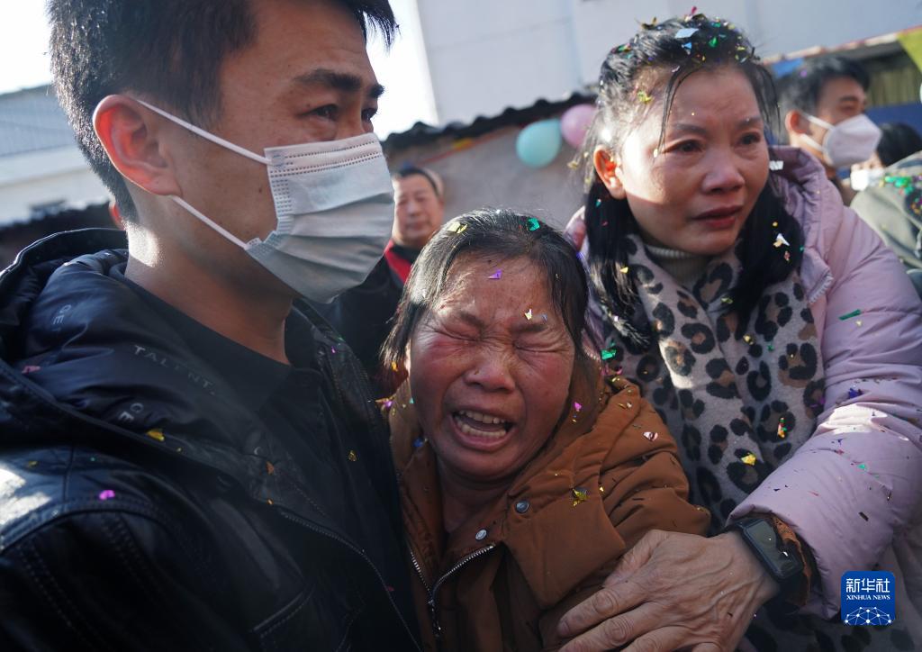 在靖安縣黃龍村,母親余陳妹(中)與兒子相擁而泣(1月30日攝)。